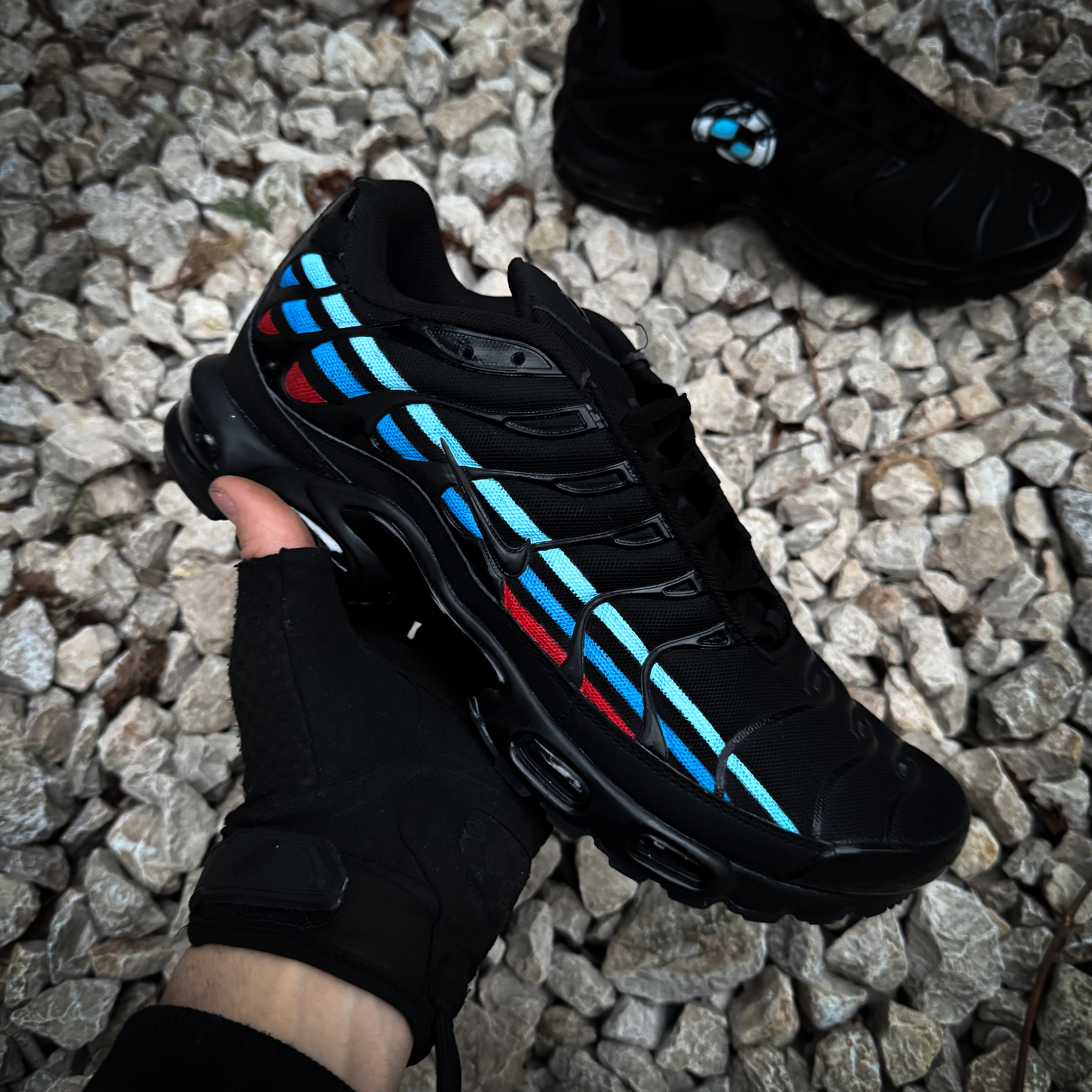 Hand-painted Nike Air Max TN custom sneakers inspired by BMW M performance aesthetics, blending bold racing colors with a raw artistic finish. Each pair is one-of-a-kind, combining streetwear attitude with motorsport precision. custom Air Max Plus Nike TN custom sneakers hand-painted sneakers BMW M inspired sneakers performance-inspired footwear luxury streetwear sneakers automotive inspired shoes motorsport design sneakers unique custom sneakers one of one sneakers limited edition sneakers urban performance style racing culture footwear high-end custom shoes sneaker art design statement sneakers street racing aesthetic bold colorway sneakers premium custom footwear